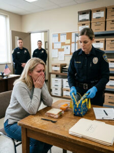 The officer said nothing, her face unreadable as she began methodically removing items from the lunchbox one by one. A sandwich wrapped in plastic, an apple, a juice box, a small container of what appeared to be cookies. Each item slid across the table, normal, harmless, and yet somehow foreboding.